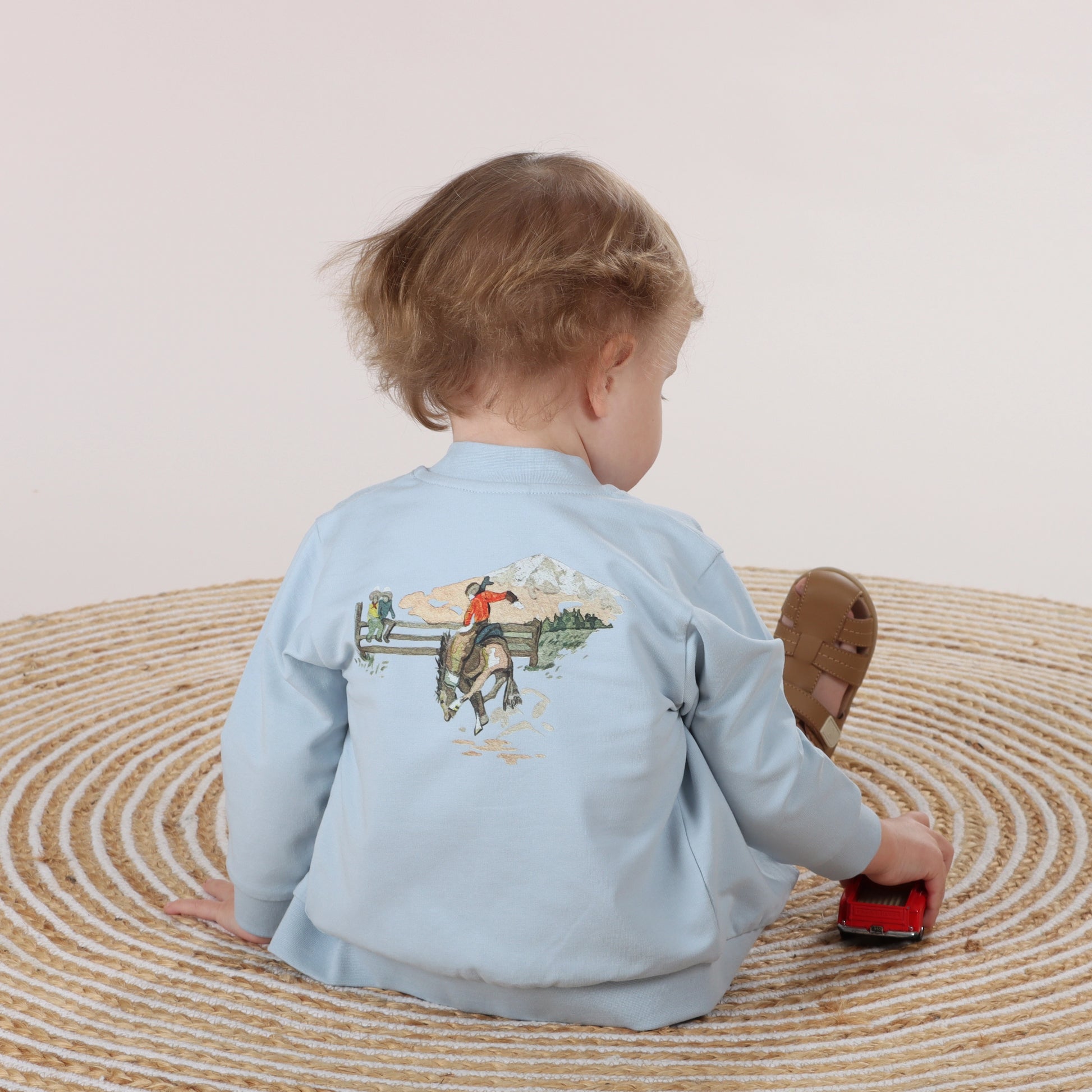 Little Bee by Dimples Wild West Collection is made using Oeko-Tex Certified Organic Cotton. With its versatile style, this stunning blue with a cowboy design on the back adds flair to any outfit, ensuring your baby looks adorable wherever they go.