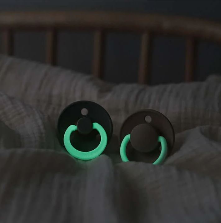 They have a round shield that is designed to curve away from your baby's face to allow for air circulation and prevent skin irritation. The night glow Bibs Dummy has a luminescent ring, which glows in the dark. For best results, hold the pacifier towards a lamp for approximately 10 seconds.