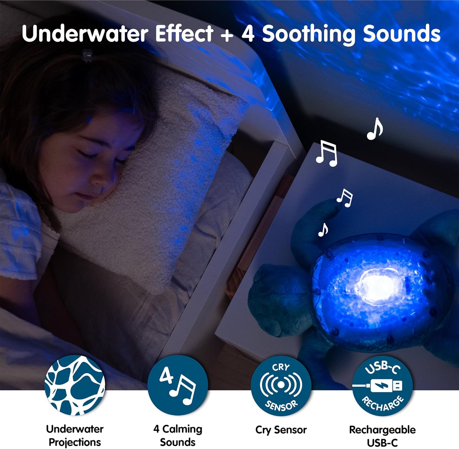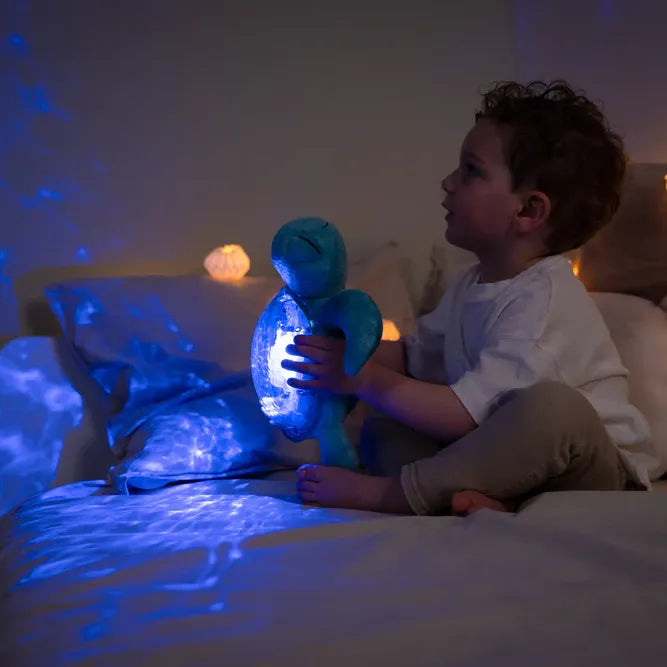 The Tranquil Turtle™ - Aqua is a gentle, glowing friend that transforms bedtime into a calming ocean escape. With its patented projection, it casts soft, moving waves across the ceiling, filling the room with a peaceful underwater glow.